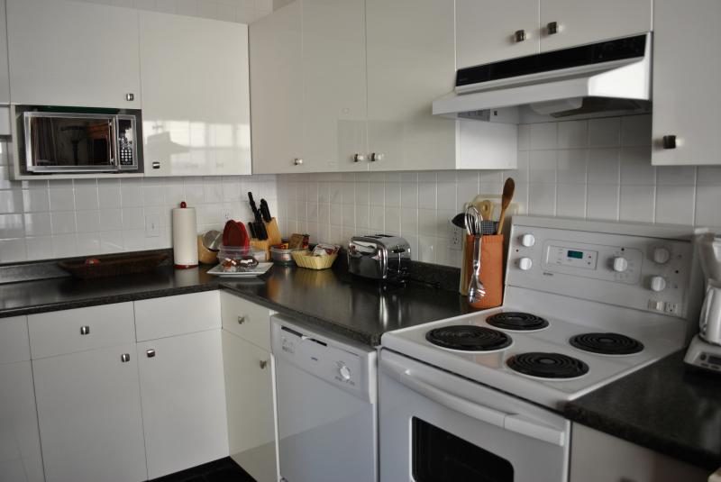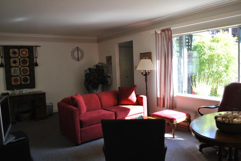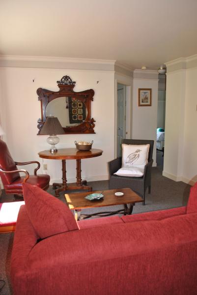 The “Cottage,” with its combination of antiques and contemporary furnishings gives a feeling of quiet luxury throughout. A fully equipped kitchen with fridge, stove/oven, and microwave is included. The added luxury of a dishwasher and an in-house washer-dryer combo make this the ultimate in “home away from home” comfort and convenience. The handsomely finished bathroom includes a large walk-in shower with unrestricted water flows.