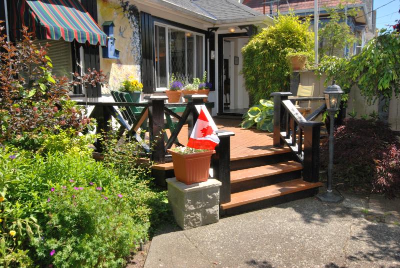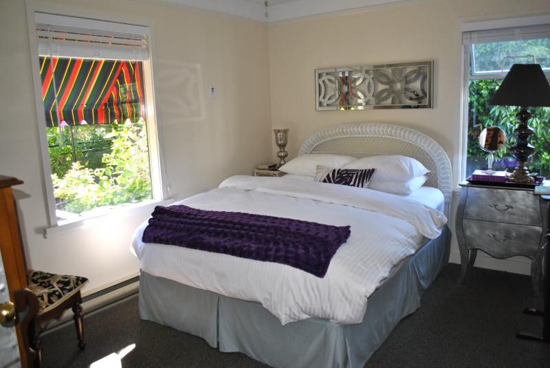 The “Cottage” at Heathergate is reminiscent of an English country cottage retreat, and this one has its own lych gate entrance to a private garden with umbrella table, large south-facing porch deck, and an adjoining herb garden. Let’s just say that more than one gin and tonic has been enjoyed out here in the summer sun! Step through the Cottage’s distinctive door and 825 square feet of spacious comfort greets the visitor. There are two bedrooms, each with a queen-size bed. Both bedrooms are provided with duvets & comfy bed linens.