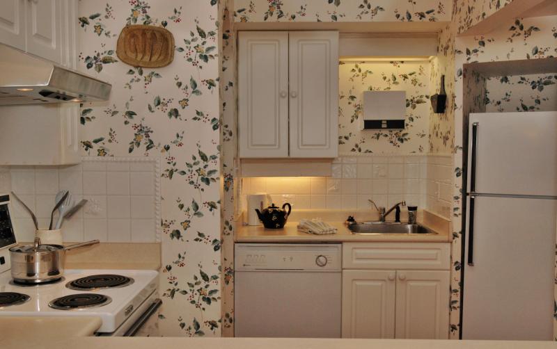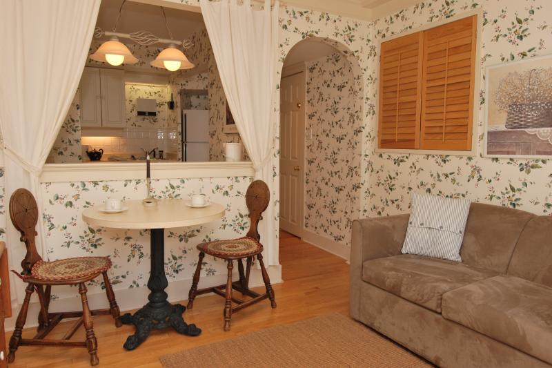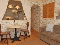 Wildflower Garden has its own private external entrance. The delightful full kitchen, affectionately referred to by us as the ‘bistro’, is complimented with an adjoining eating and sitting area and a wall mounted TV. The inviting bedroom offers the comfort of a queen size bed, and a secondary TV. The ensuite bathroom is nicely appointed and includes a glass encased walk-in shower. The charming atmosphere and handsome furnishings contribute to the welcoming feel of this suite.